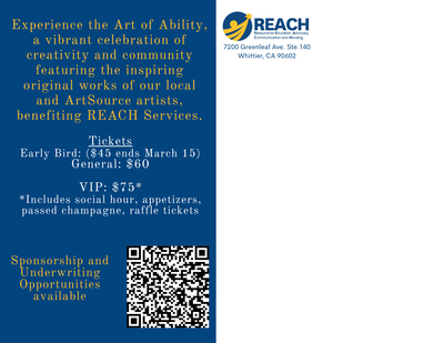 Experience the Art of Ability, a vibrant celebration of creativity and community featuring the inspiring original works of our local and Art Source artists, benefiting REACH Services.